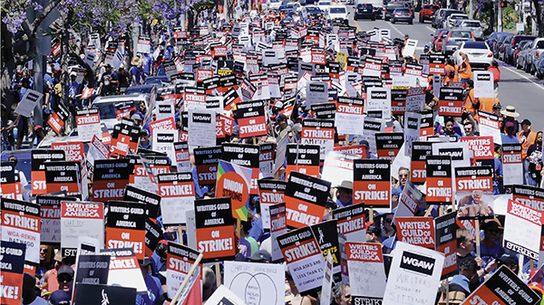 A sea of strike signs floods 6th Street during the 2023 WGA Strong March and Rally2023 – Gains made in the contract include: in episodic staffing, first-ever writers’ room staff size minimums and guaranteed duration of employment, including a requirement to employ writers in production, new premium wage tiers for writer-producers and for work in pre-greenlight rooms, and script fees for staff writers. In feature employment, the new contract includes a guaranteed second step and accelerated payment schedule, along with improved compensation for streaming features. The contract also includes restrictions on the use of artificial intelligence on MBA-covered projects. Appendix A writers gained minimum terms for comedy-variety, quiz & audience, and other non-dramatic programs when those shows are made for streaming. Made for AVOD shows gained first-ever minimum terms and residuals. In subscription streaming, gains include improvements to the existing residual including an outsize increase in the payment for foreign streaming, along with a new viewership-based bonus and new data transparency. Finally, the deal included strong minimums increases and improvements to employer pension & health contributions, including that each member of a writing team will receive contributions as if they are writing as an individual.