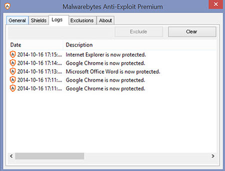 Anti-Exploit runs in the background, and there really are no settings that you have to adjust. A tab for Shields tells you what’s covered, and the Logs tab shows you what’s currently running and being protected. You can add and remove shields, or clear logs, but for most people, you won’t. You just sit back and use your computer like always.