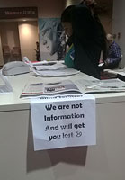 And we’ll leave you with my favorite sign that I came across at the show. It was at a poor, beleaguered desk providing assistance for people with special needs to get around CES. The desk was well-marked, absolutely clear for all to see that the one thing, the only thing they offered was help for those with a physical disability. Yet all the time, as a massive onslaught of people barreled by non-stop, attendees would think it was a basic Information Desk and pummel the inundated staff with relentless questions that they simply couldn’t and were not remotely equipped to answer. And so, as a last resort out of desperation, they came up with this –