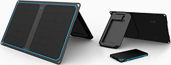 GoalZero is also moving into a more “general consumer” line through their parent company, NRG. I was very impressed with their Sunbook 7 Kit (made for Smartphones) and the larger Sunbook 14 (for tablets). It’s an all-in-one package that has a solar panel with fold-out legs, and a storage battery – connected to the solar panel to charge it – that sits in a convenient pocket, though it’s removable. The kit is designed very elegantly and conveniently for the general public, rather than backpackers. The Sunbook 7 battery is 3850 mAh (enough for almost two charges of a Smartphone), while the battery for the Sunbook 14 is 12,000 mAh. By the way, that stands for “milliampere.”