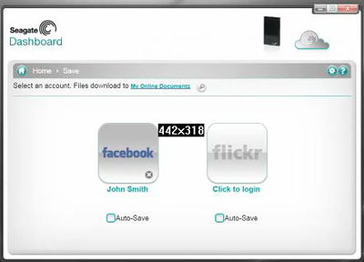What “Save” does is download files from several social media services (like Facebook, Flickr and YouTube) and saves them to a default folder on your hard drive. (You can change this folder to be anywhere on your hard drive, or even put it on the Backup Plus external drive.) It does this manually – Dashboard includes icons for these three social media services, and you simply use your normal log-in – or will download the files automatically, whenever you’ve made a change to your personal social media Web page. (Many people, for instance, will take photos or videos on their Smartphones and upload them to their social media site, and use this as a sort of backup. The problem is that material isn’t backed up especially well on social media sites. And keeping the original files stored on your phone, which is unfortunately common, is not an ideal backup solution. This resolves that issue.)